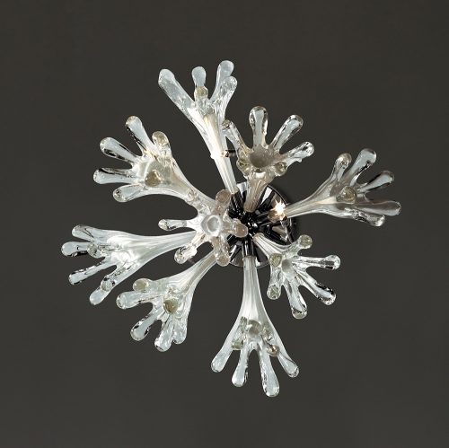 A spectacular and original design concept based upon a substantial special hand crafted glass.  Every glass is unique and the central cavity of the glass is filled with a gloss white resin.  Mounted on Polished Chrome framework which enhances the splendour of this range. The combination of clear and white glass illuminated with the brightness of G4 lamps creates a stunning effect.