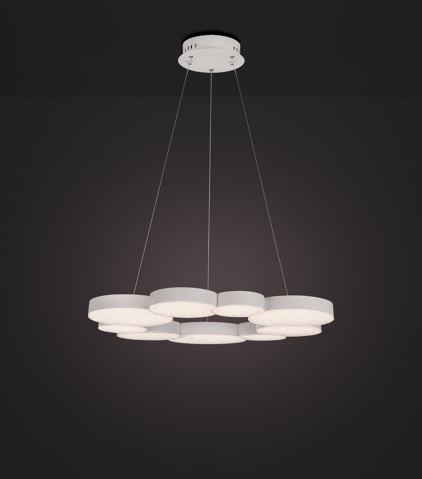 This stunning ultra-modern LED collection creates patterns and obscure shapes using individual circles in a variation of sizes. Each of the smaller circles are composed of a band of white metal in which the 3000K integral LEDs sit and are concealed by a striking crystalized diffuser which creates a distinctive feature. With each ceiling light comes the ability to control and dim the colour temperature using the remote control included with the light. Offering a variety of adjustable pendants, flush ceiling lights and wall lamps Lunas is a truly comprehensive range with a fixture to suit any requirement. This range has a 3 year warranty.