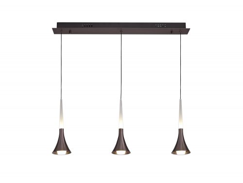 A collection of sleek pendants, Monmouth’s modern flared cone shape creates a funnel effect enhancing the light emitted from the integral 3000K LEDs. The satin brown colour finish of the metal framework provides a more adaptable option for neutral room settings where a warmer feature is required, without compromising the benefits of modern LED technology. Available in a single pendant, round 3 light pendant or linear 3 light pendant, this range is appropriate for illuminating a smaller room or enhancing a dining area.