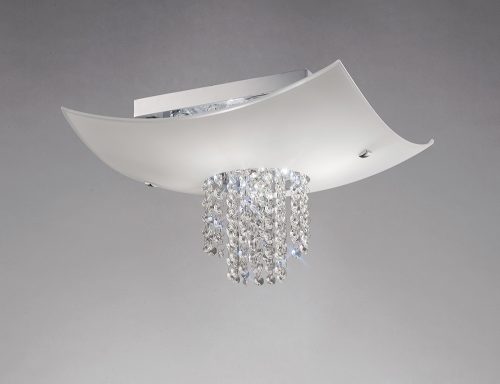 A flush fitting created using an impressive 40cm stylish curved frosted glass, with increased depth and solidity creating a greater strength and statement. This featured component arches towards the ceiling concealing the square Polished Chrome plate. The fitting displays a waterfall of attractive Asfour crystal strands descending from a circular cut-out in the centre of the glass, adding extra impact to the sleek and appealing design.