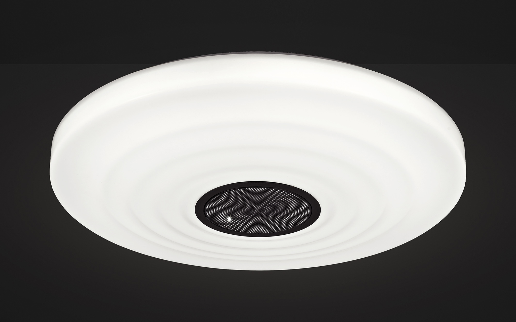 Ondas is part of Mantra Fusion’s innovative ceiling light speakers collection. This round flush fitting use bluetooth connection to link your device and play music through the speaker in the centre of the large acrylic diffuser. This diffuser is moulded to create a soundwave pattern. The integral LEDs boast a 4200 lumen output and can be dimmed between 3000K-6500K with the remote control supplied with the fitting.