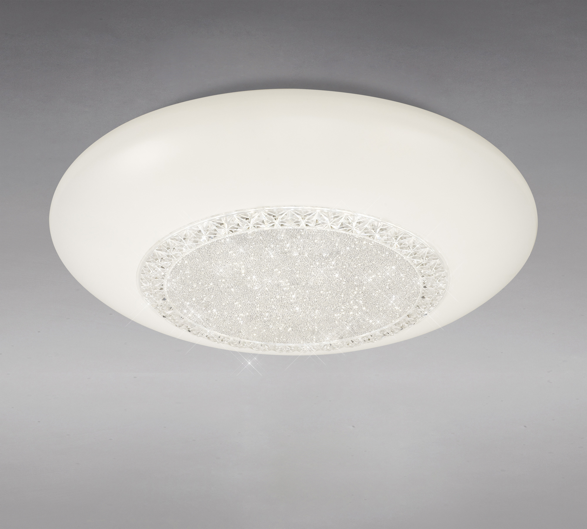 Available in a 41cm and 52cm diameter, the Opera flush ceiling light collection is stunningly designed, providing a decorative tuneable lighting option. The colour temperature ranges from 3000-6500K with the convenient remote control feature enabling the consumer to determine their desired illumination output from the comfort of their seating area. Concealing the integral LEDs is the round opal white diffuser. Embedded in the centre of the light is a circular cluster of minute crystal beads, bordered by an edging of larger square crystals. The crystal aspect of this design transforms an otherwise plain light into a stylish, sophisticated range.