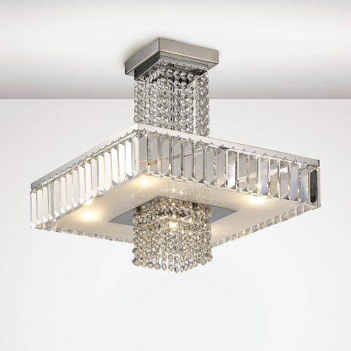Ophelia is a truly impressive collection of 2 ceiling fittings that definitely add sparkle and glamour to venues and residences. Interesting in form, every inch is either draped in crystal or finished in polished chrome. The central column is a brilliant display of crystal strands that encase the main body in a dazzling curtain of quality crystal. The rectangular surround is bordered by crystal pieces that reflect the light. The glass plate is positioned beneath the lampholders so softens and diffuses the light.