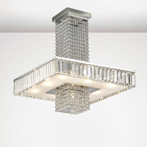 Ophelia is a truly impressive collection of 2 ceiling fittings that definitely add sparkle and glamour to venues and residences. Interesting in form, every inch is either draped in crystal or finished in polished chrome. The central column is a brilliant display of crystal strands that encase the main body in a dazzling curtain of quality crystal. The rectangular surround is bordered by crystal pieces that reflect the light. The glass plate is positioned beneath the lampholders so softens and diffuses the light.