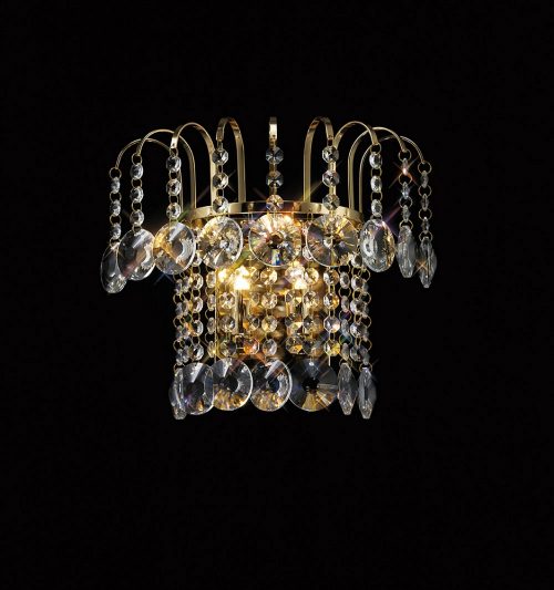 Due to the extensive popularity of the Chrome Rosina range Diyas has released the entire collection in a French gold finish. This comprehensive family of crystal pendants and complimenting switched wall lamp features delicate framework which curves out in a series of arms. G9 lampholders are submerged in a cascade of crystal strands composed of crystal buttons and finished with 45mm crystal disks. The upper curve of the frame holds strands with crystal disks whilst the lower curve is dressed with a 30mm crystal ball and single crystal button.