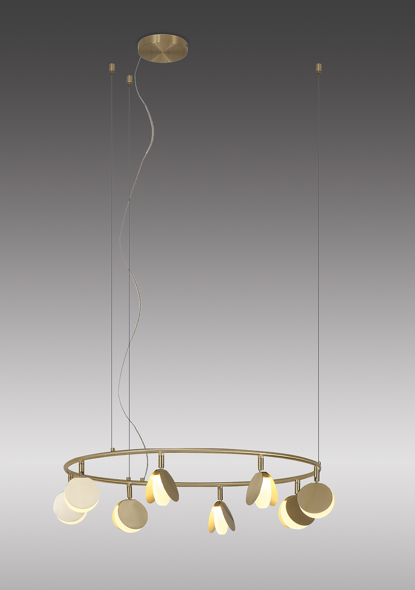 Mantra’s Shell range hosts a fountain of attractive key features the main focus of which is adaptability. The stunning gold framework accentuates the integral 3000K LEDs each situated within a number of round disks. Each LED head has an adjustable directionality making the halo shape of the frames appear more like stage lights. The central ceiling plates are unassuming and direct the electrical wire whilst the suspension cables instead can be fixed in multiple positions along the ceiling offering a wider range of compositional design. This concept, new to the market, is untraditional and intriguing.