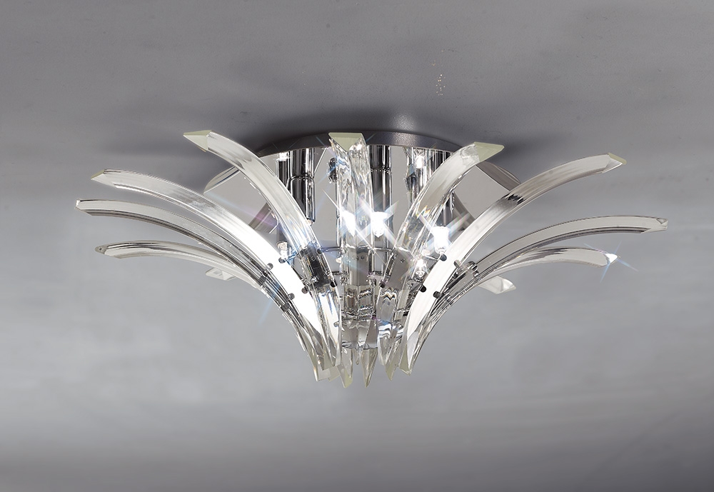 A stunning design of Polished Chrome fittings surrounded by curved crystal prisms creating a uniform concept throughout the range. Each substantial hand polished crystal refracts the light to create an impressive colour spectrum. This modern concept of a crystal chandelier is an impressive one. The wall lamp also boasts a concealed switch while the large pendant is an outstanding 90cm diameter.