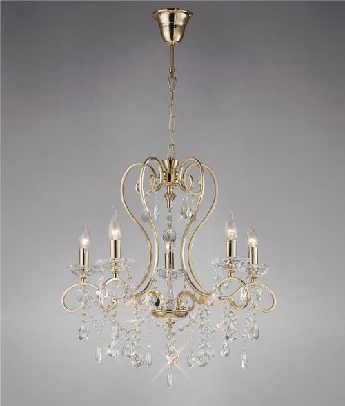 This beautiful classic chandelier range is available in both Polished Chrome and French Gold and is given a contemporary twist with the selection of crystal used to dress the fittings. Vela pendalogues bring a new crystal design to the Diyas collection, this substantial crystal piece featuring dozens of cuts intriguingly concaves inwards to provide even more character to the substantial pendalogue. A unique sconce has also been selected to complete the glamour of this range.