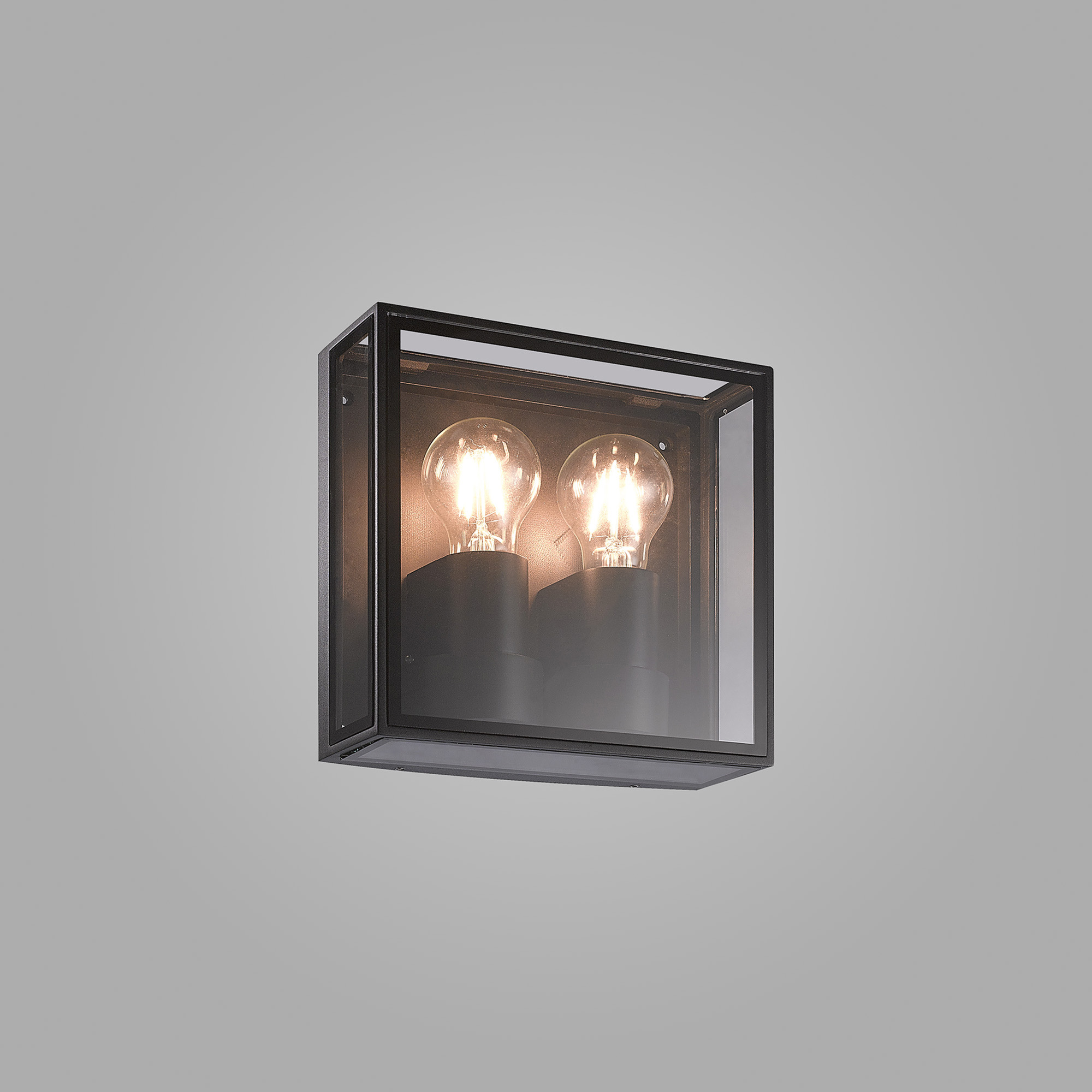 Both outdoor IP65 rated wall lamps in the Verbier range have the same outer structure. The display casing concept sees a clear glass box housing two E27 lampholders which is framed within a Anthracite metal outline. The variation offered by the alternative fixtures is the layout of the lampholders with one wall lamp showing them in the same direction and the other having both lampholders facing towards each other.