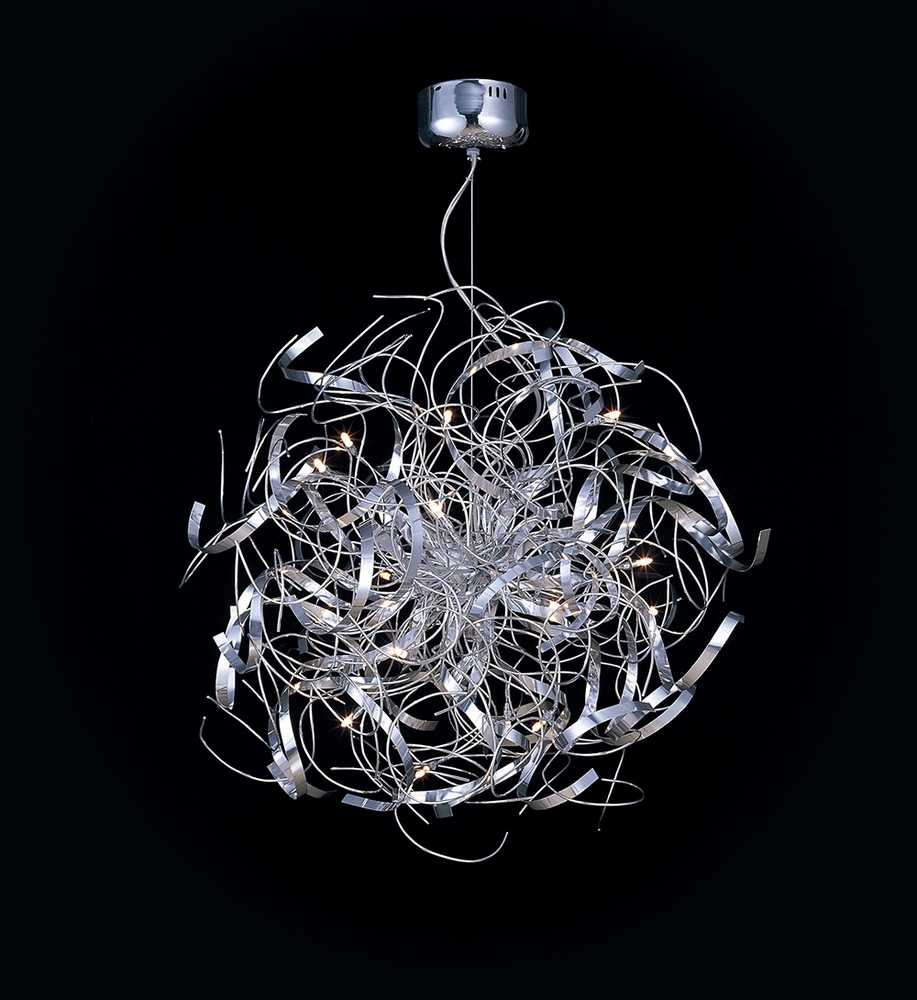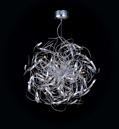 A fascinating suite of Polished Chrome wires entangled with Aluminium strips. The maximum number of strips and wires have been used to ensure an astonishing product is created allowing the reflection from the mass of metalwork. The flexibility of the these strips allows an element of individual design thus creating a spectacular light fitting. The smallest 3 light fitting can be used either as a wall or ceiling lamp.