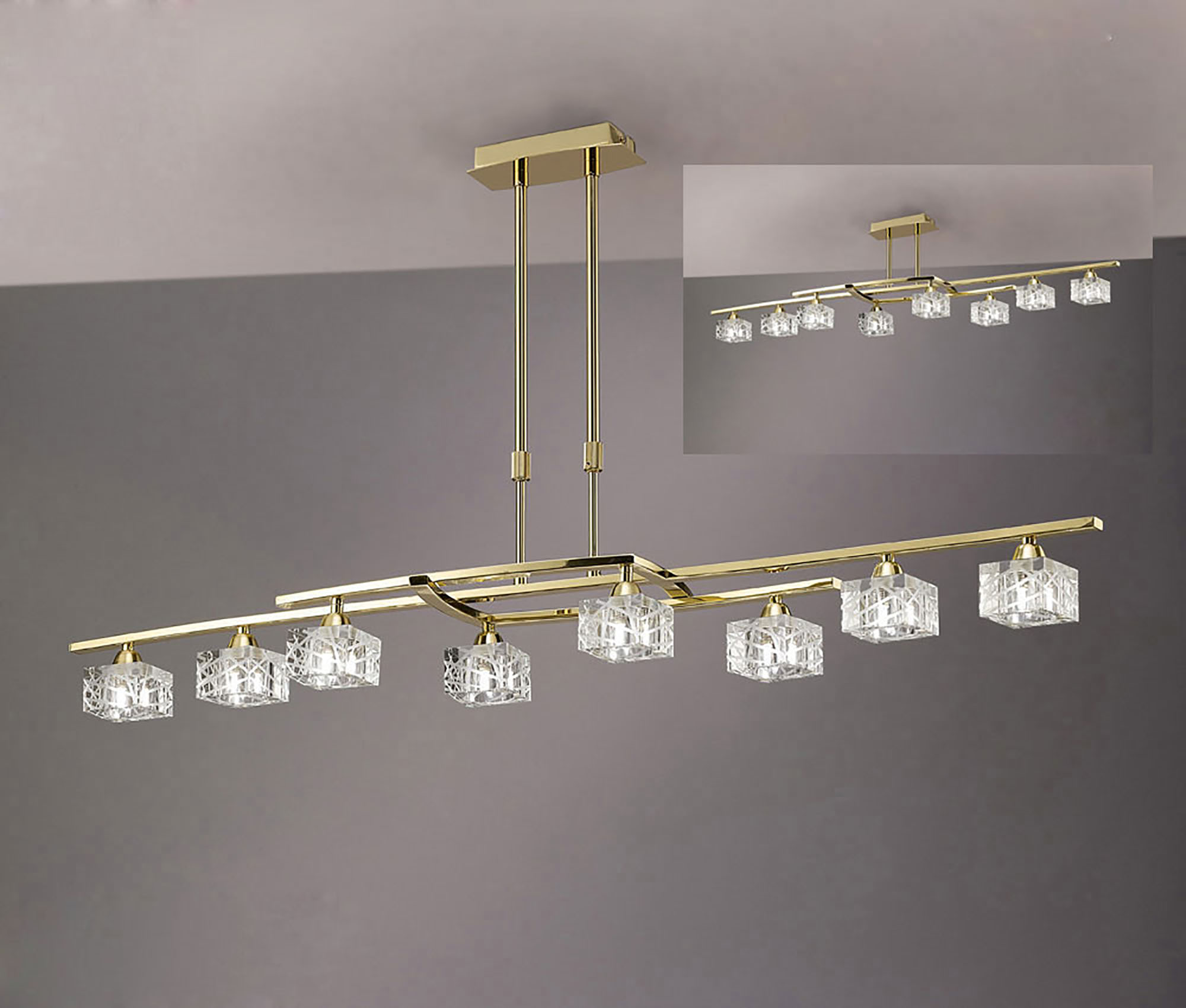 The Zen range is a an austere proposal of lighting fixtures in a polished brass finish. Unadorned straight lines accompany high quality square clear glass shades that have an intricate crisscross pattern etched on the surface.